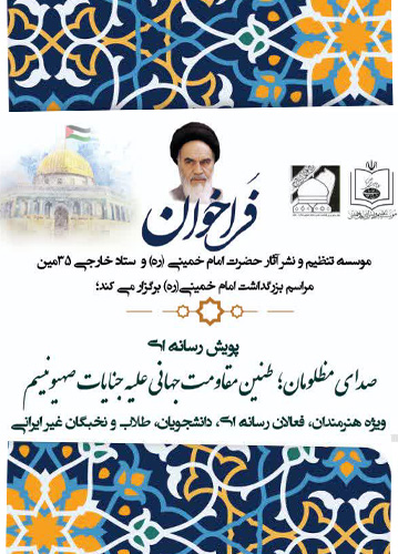 موسسه تنظیم و نشر آثار حضرت امام خمینی(ره) و ستاد خارجی بزرگداشت سی و پنجمین سالگرد ارتحال حضرت امام خمینی (ره)، پویش رسانه ای صدای مظلومان طنین مقاومت جهانی علیه جنایت صهیونیسم - ویژه هنرمندان فعالان رسانه ای دانشجویان طلاب و نخبگان غیر ایرانی را برگزار می نماید